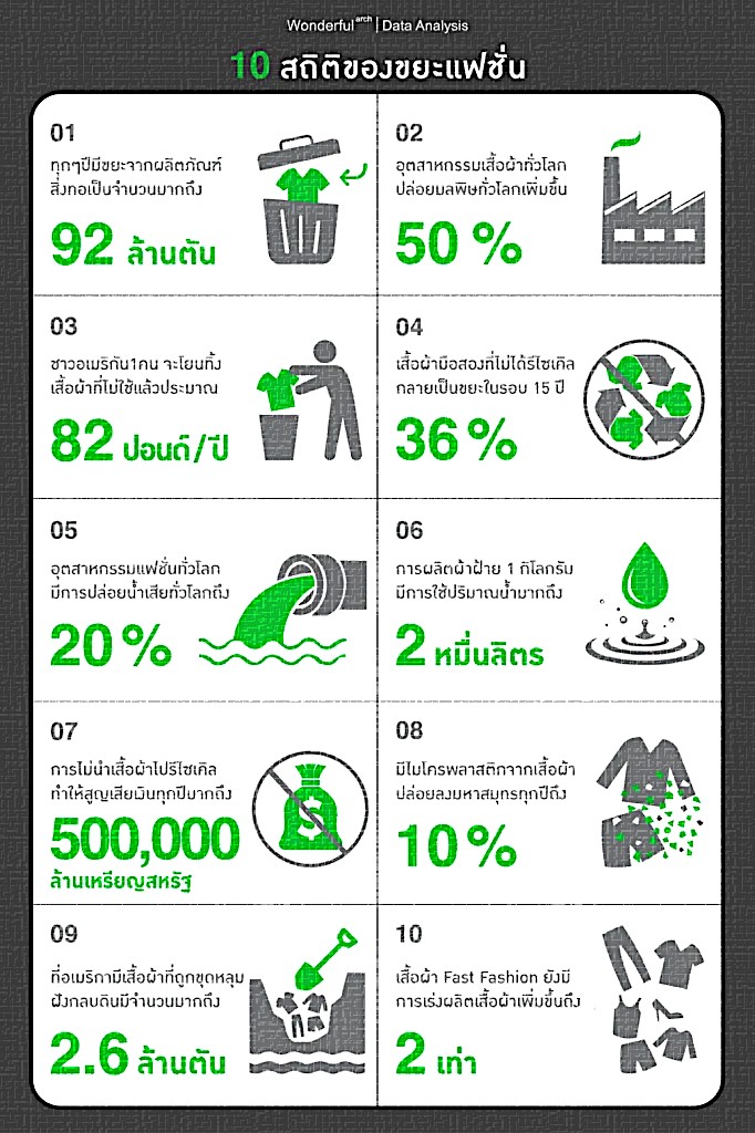 • ตระหนักถึงสิ่งแวดล้อม: ผลกระทบของอุตสาหกรรมแฟชั่นต่อทรัพยากรธรรมชาติ เช่น น้ำเสีย ขยะผ้า และการปล่อยคาร์บอน ทำให้เกิดกระแส Sustainable Fashion