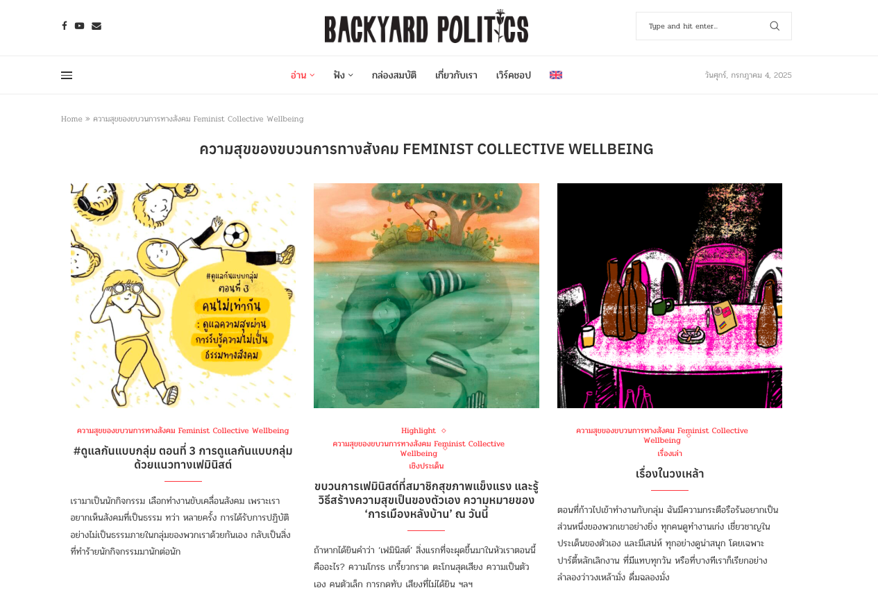 คำถามข้างต้นคือ จุดเริ่มต้นของ Backyard Politics การเมืองหลังบ้าน กลุ่มการดูแลกันและกัน สำหรับนักกิจกรรมผู้หญิงและกลุ่มผู้ที่มีความหลากหลายทางเพศในเอเชียตะวันออกเฉียงใต้ บนแนวทาง Collective Care หรือการดูแลเอาใจใส่ร่วมกันไม่ผลักภาระการดูแลสุขภาพกายใจไปให้กับคนหนึ่งคน ร่วมกันรับรู้ ยืนยัน และร่วมดูแลสุขภาพกายใจของเพื่อนร่วมงาน เพื่อนร่วมอุดมการณ์ได้อย่างสม่ำเสมอ ด้วยความเชื่อว่าสังคมจะเกิดการเปลี่ยนแปลงได้อย่างยั่งยืน ต้องมีการดูแลผู้ที่ลงมือสร้างการเปลี่ยนแปลง นำเสียงของผู้ที่ถูกผลักให้อยู่ชายขอบออกมาให้ผู้คนได้รับรู้ ให้เพื่อนร่วมอุดมการณ์ได้รับฟัง โดยขับเคลื่อนงานผ่านองค์ความรู้ด้านความสุขและสุขภาพ (Wellbeing) ของนักกิจกรรมผู้หญิงและ LBTQ ในเอเชียตะวันออกเฉียงใต้ สร้างความร่วมไม้ร่วมมือระหว่างนักกิจกรรมจากหลากหลายพื้นที่ จากประเด็นการขับเคลื่อนที่แตกต่างกัน ไปจนถึงสร้างองค์ความรู้ในการดูแลกันและกันจากประสบการณ์ตรง