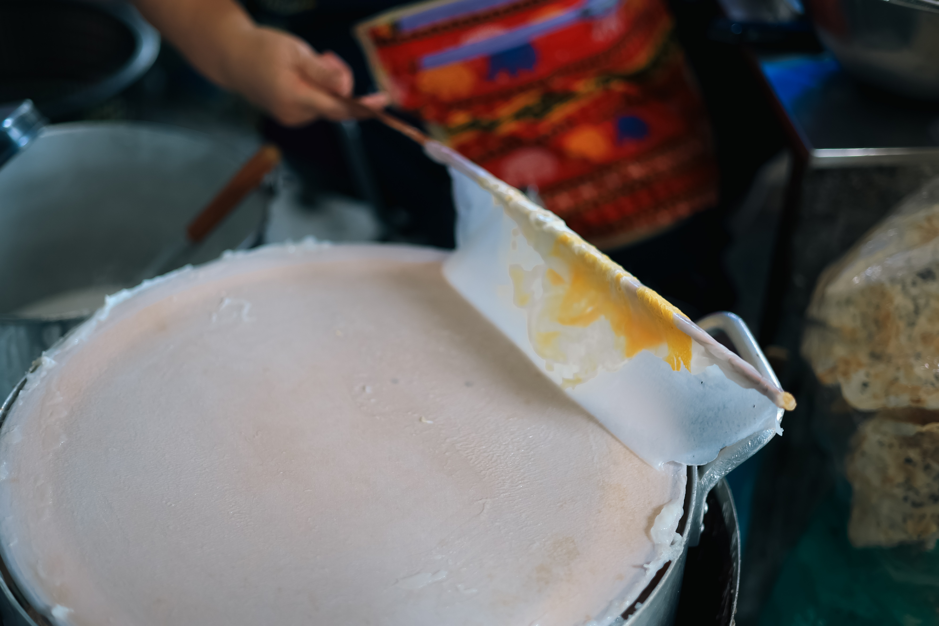 ถึงจะปรับเปลี่ยนเมนูและรสชาติเพื่อให้ถูกปากคนยุคใหม่ แต่แม่แวงบอกว่า ที่ร้านข้าวเกรียบปากหม้อศรีเทพก็ยังเน้นคัดสรรวัตถุดิบที่ดี ส่วนผสมที่มีคุณภาพ และความเชี่ยวชาญของรสมือผู้ทำ ซึ่งส่วนประกอบอื่น ๆ ก็ต้องคัดสรรให้ดีที่สุดไม่แพ้อย่างอื่น โดยเฉพาะหมูยอ หรือที่เวียดนามเรียกว่า “จ๋าหลั่ว” (chả lụa) เพราะจะต้องหั่นวางเคียงคู่ไปในจานปากหม้อด้วยในบางเมนู และส่วนใหญ่นอกจากลูกค้าจะสั่งปากหม้อแล้ว ก็มักจะสั่งหมูยอลวก หรือหมูยอต้มมาเป็นเครื่องเคียงแบบพิเศษแยกอีกจานด้วย แม่แวงเล่าไป มือก็ละเลงแป้งบางลงบนผ้าขาวที่ขึงบนปากหม้อไปด้วย หลังแป้งรับไอน้ำร้อนจนสุกได้ที่แล้ว แม่แวงก็ใช้ไม้บาง ๆ ที่ดูแล้วจับถนัดมือผู้ทำ ลงแตะบนแป้งและม้วนแป้งให้แผ่ออก ก่อนจะตักไส้หมูสับผัดกับต้นหอมที่ผัดไว้สุกแล้วลงไป และม้วนแป้งพับอีกรอบก่อนจะตักใส่จาน