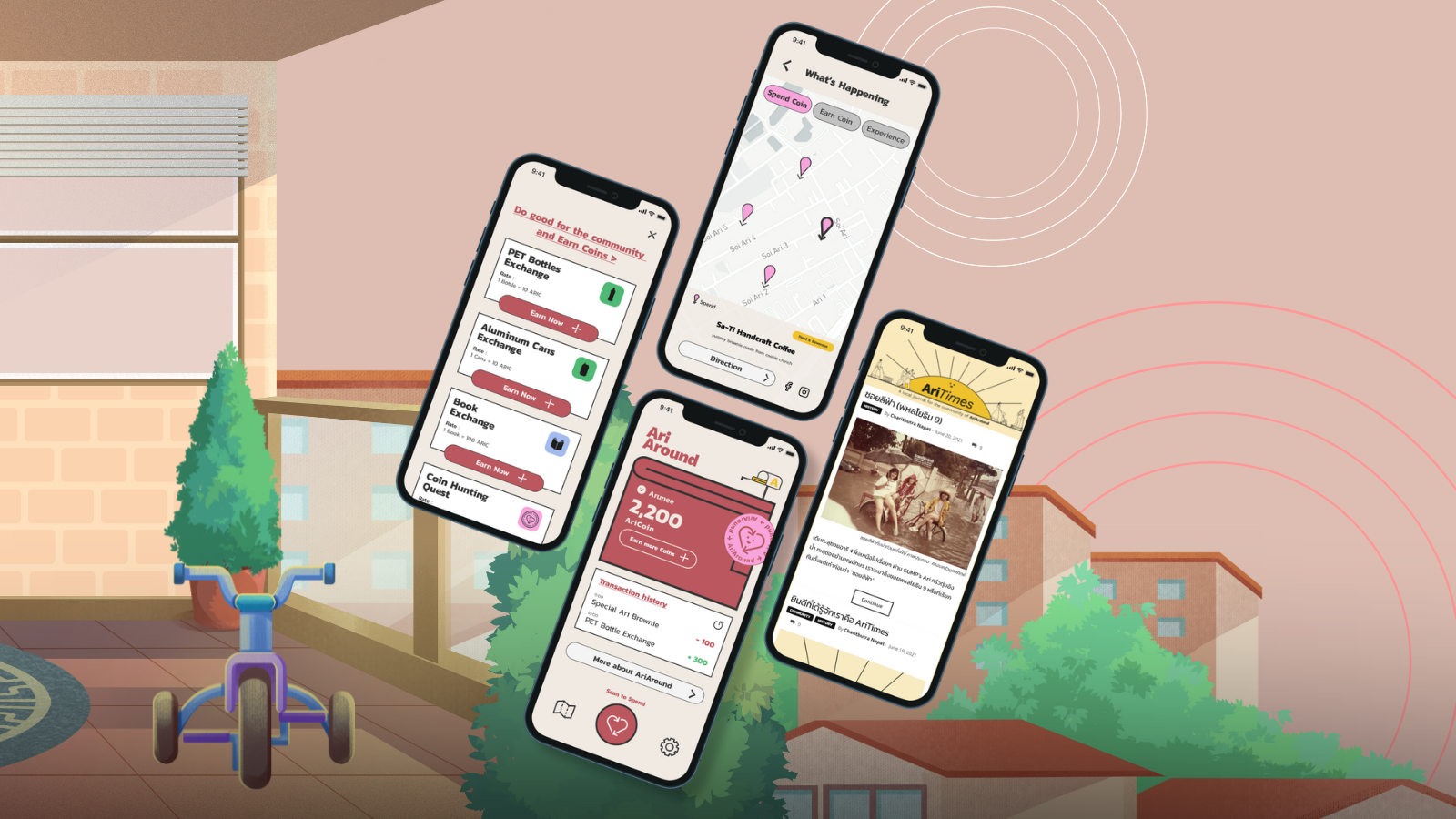 หนึ่งในนวัตกรรมที่น่าสนใจที่สุดในย่านอารีย์ ก็คือ AriAround (อ่านว่า อารีอะราวด์) เป็นแอปพลิเคชันแพลตฟอร์ม ที่ทำให้ความอารีอารอบในย่านนี้เกิดขึ้นได้อย่างเป็นรูปธรรม ผ่านอัตราแลกเปลี่ยน AriCoin หรือเหรียญอารี ซึ่งมูลค่าแปรผันตามความพึงพอใจร่วมกันระหว่างผู้ให้และผู้รับ ไม่จำกัดรูปแบบว่าจะเป็นกิจกรรมเกี่ยวกับการจัดการขยะ แนวคิดเศรษฐกิจหมุนเวียน หรือการเชื่อมโยงคนในชุมชนเข้าหากัน โดยมีกลไกการแลกเปลี่ยนที่เรียบง่าย ตรงไปตรงมา เพียงแค่นำขยะที่รีไซเคิลได้มาแลกเปลี่ยน หรือจัดเวิร์กช็อปให้คนมาร่วมเรียนรู้ไปด้วยกัน หรือแบ่งปันทักษะที่ตัวเองมีให้คนในชุมชนก็จะได้รับเหรียญอารีผ่านทางแอปพลิเคชัน เมื่อสะสมไปเรื่อยๆ ก็สามารถนำเหรียญนี้ไปแลกขนมปังจากคาเฟ่ แลกต้นไม้ฟรี หรือใช้สำหรับเข้าร่วมกิจกรรมอื่นๆ ต่อไปได้
