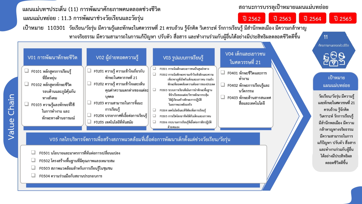 เป้าหมาย 110301 วัยเรียน/วัยรุ่น มีความรู้และทักษะในศตวรรษที่ 21ครบถ้วน รู้จักคิด วิเคราะห์ รักการเรียนรู้ มีส านึกพลเมือง มีความกล้าหาญ ทางจริยธรรม มีความสามารถในการแก้ปัญหา ปรับตัว สื่อสาร และทำงานร่วมกับผู้อื่นได้อย่างมีประสิทธิผลตลอดชีวิตดีขึ้น